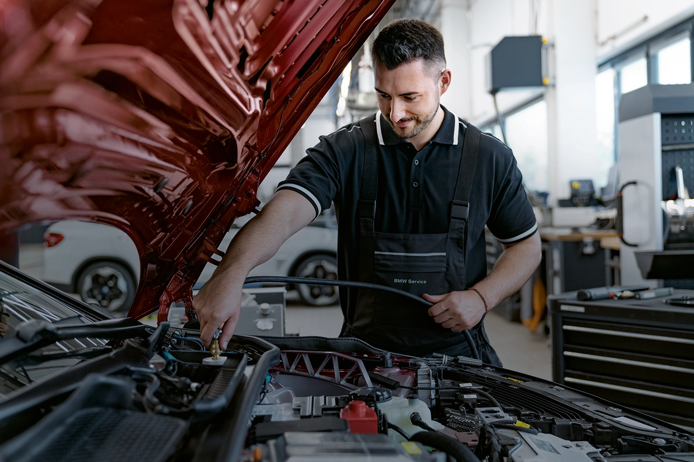 Ein BMW Mechatroniker führt einen BMW Saison-check an einem roten BMW durch.